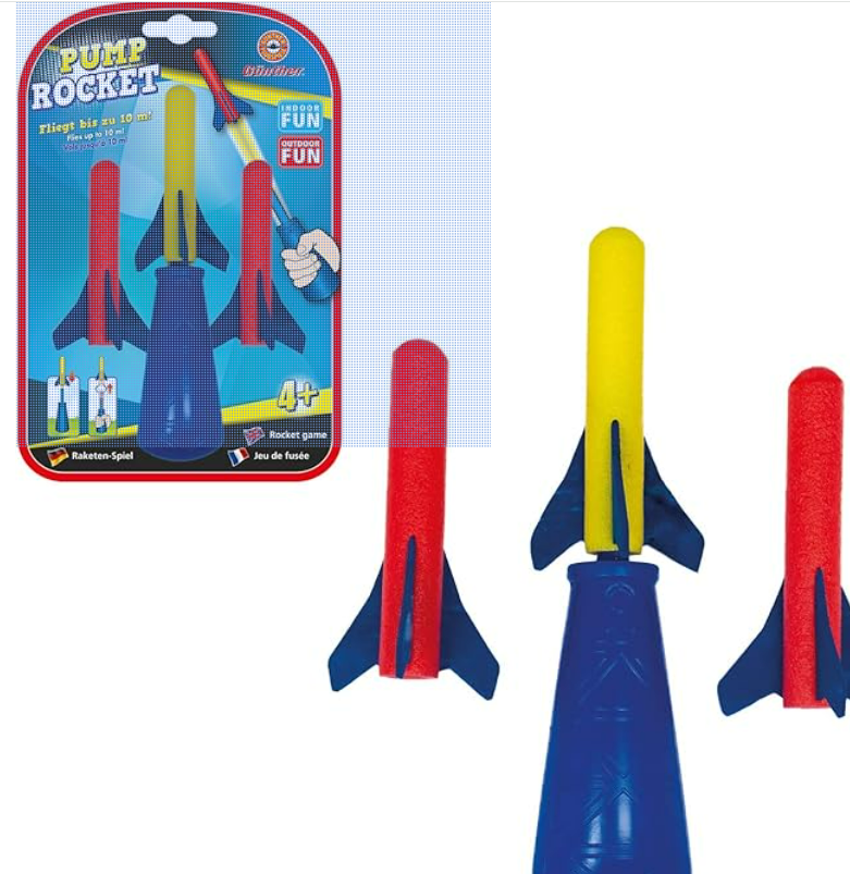 Raketen-Spiel Pump Rocket inklusive 3 Schaumstoff-Raketen Fliegt bis zu 10 Meter weit Einfach die Schaumstoff-Rakete aufstecken – zielen – und die Rakete abschießen Fliegt bis zu 10 Meter weit Geeignet für Kinder ab 4 Jahren